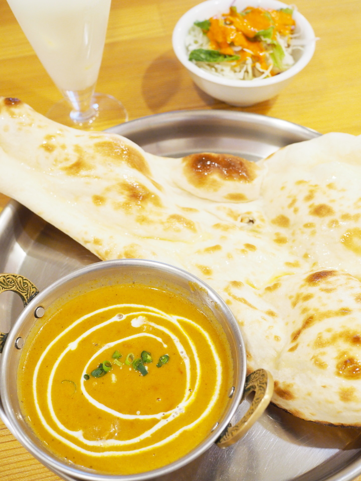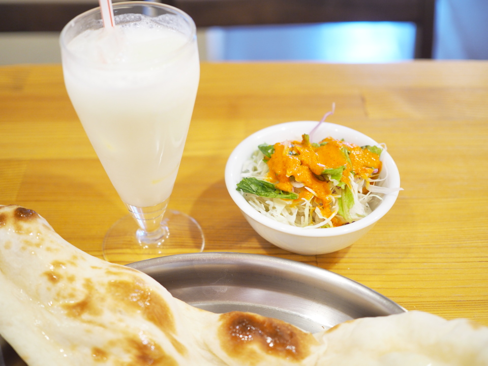 サラダとドリンクが付いてきます。ラッシーをチョイス。なかなか飲む機会がないですからね。