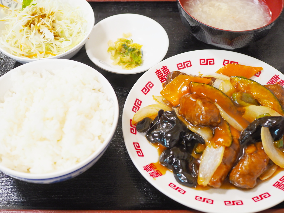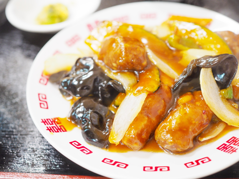 程よい甘酸っぱさのタレにからまった酢豚たち。小ぶりながら、実がしっかりした豚肉。